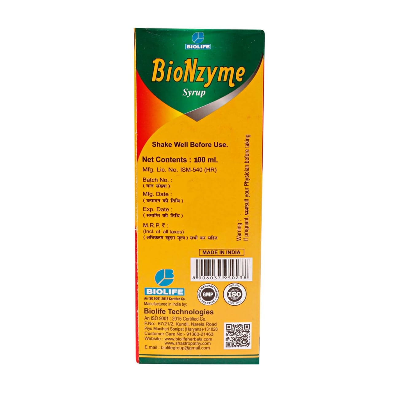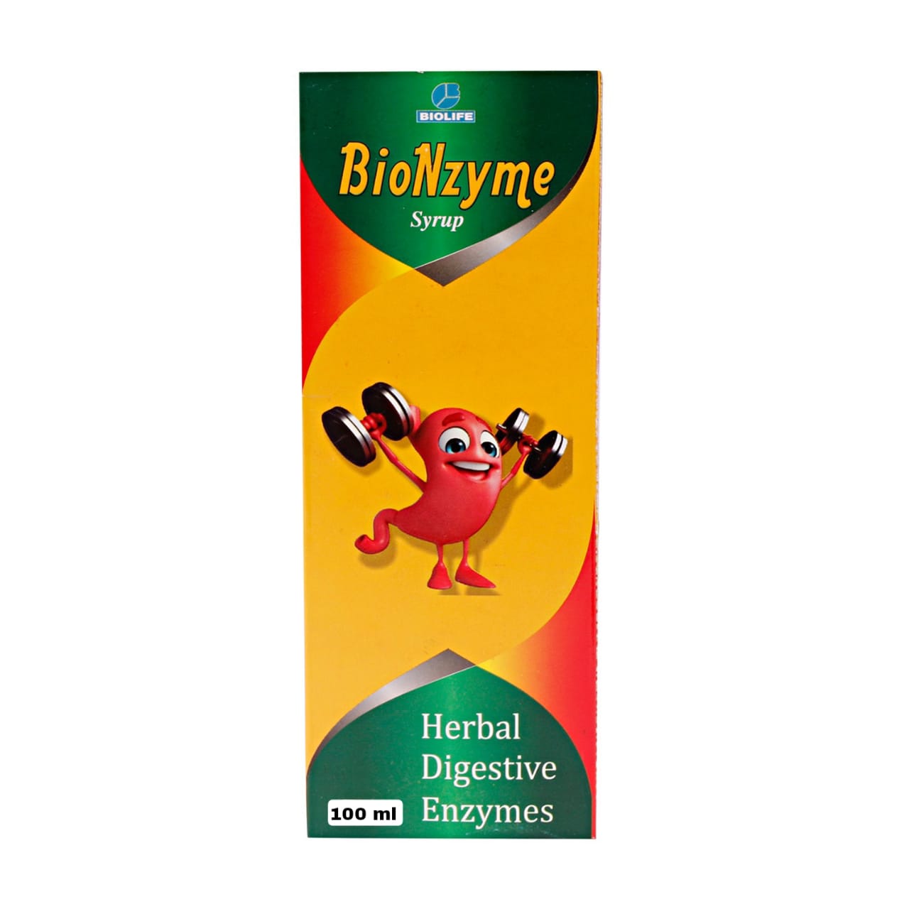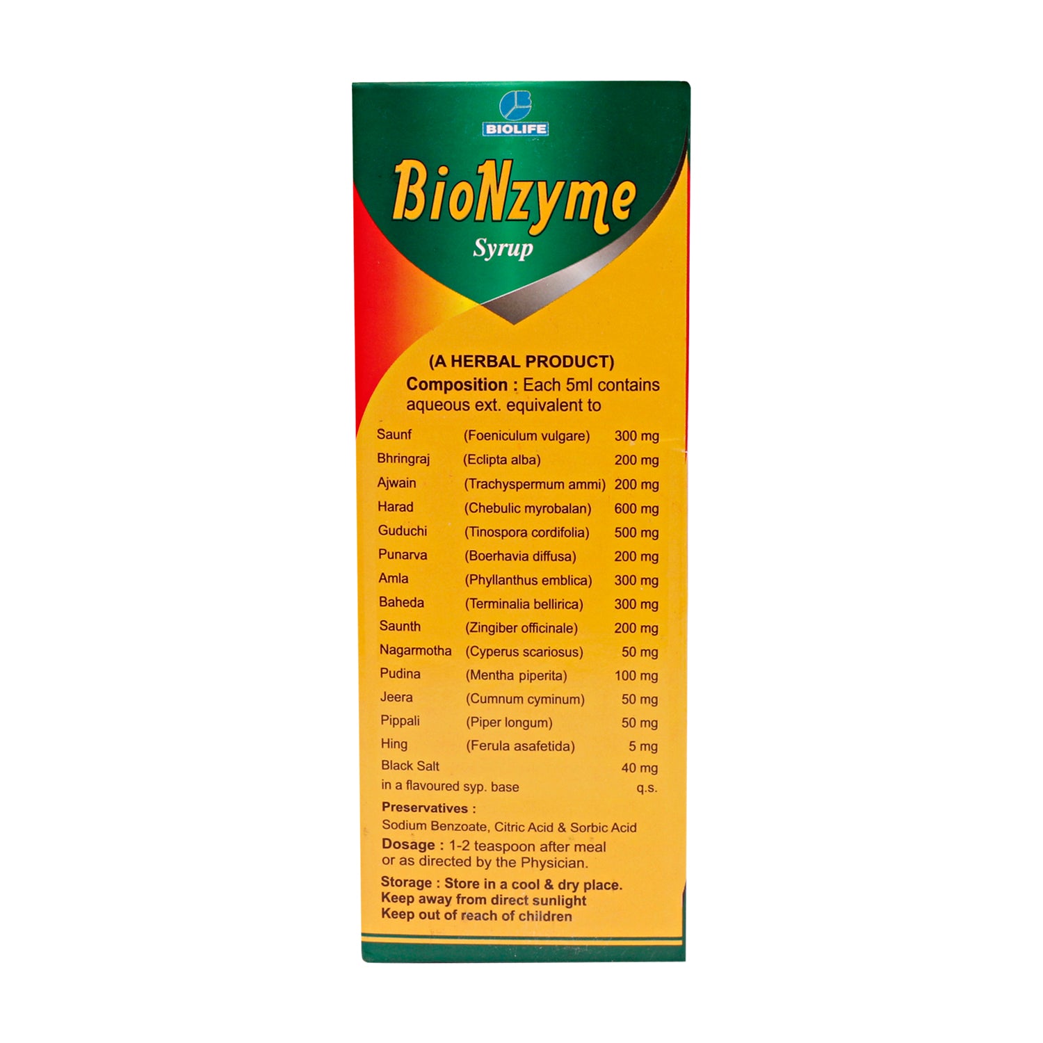 BioNzyme Syrup is an "A Herbal Product" formulated as a digestive tonic. It contains a comprehensive blend of Ayurvedic ingredients known for their carminative, digestive, and stomachic properties. This syrup is designed to aid digestion and address various stomach discomforts.