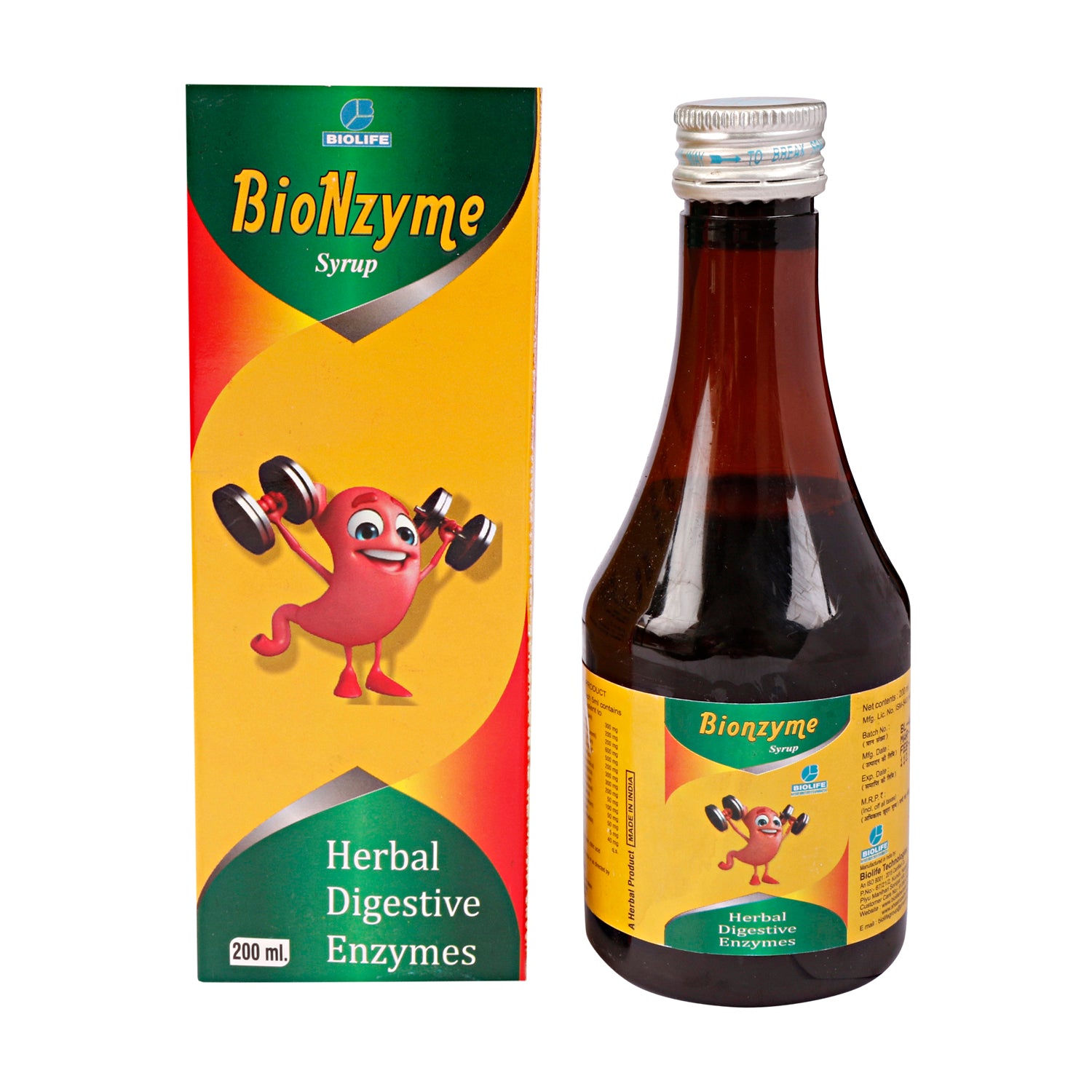 BioNzyme Syrup is an "A Herbal Product" formulated as a digestive tonic. It contains a comprehensive blend of Ayurvedic ingredients known for their carminative, digestive, and stomachic properties. This syrup is designed to aid digestion and address various stomach discomforts.