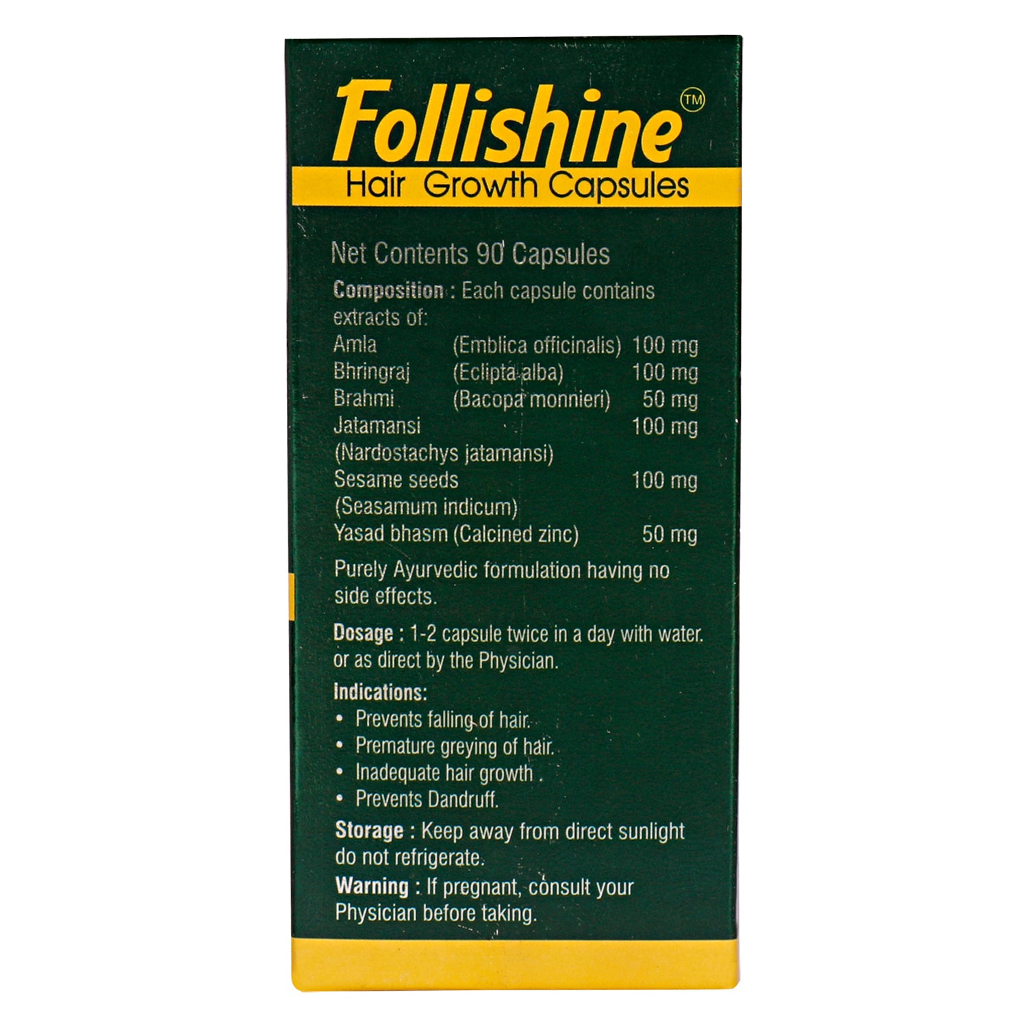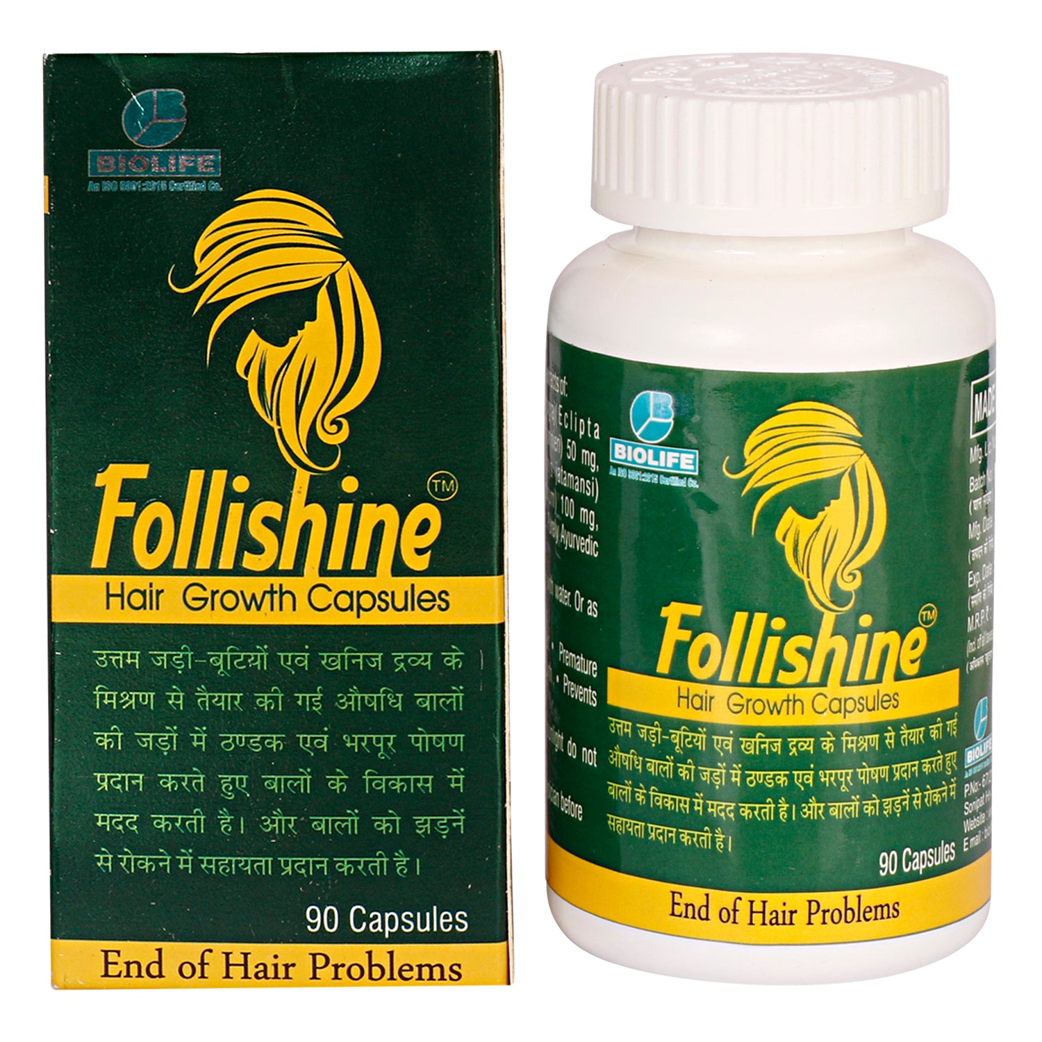 Regular use of FOLLISHINE CAPSULES (Hair Fall Cap) reduces hair fall due to breakage. FOLLISHINE CAPSULES formula nourishes the hair root and help strengthen hair. Indications: Prevents falling of hair, Premature greying of hair, Indequate hair growth, Prevents Dandruff.