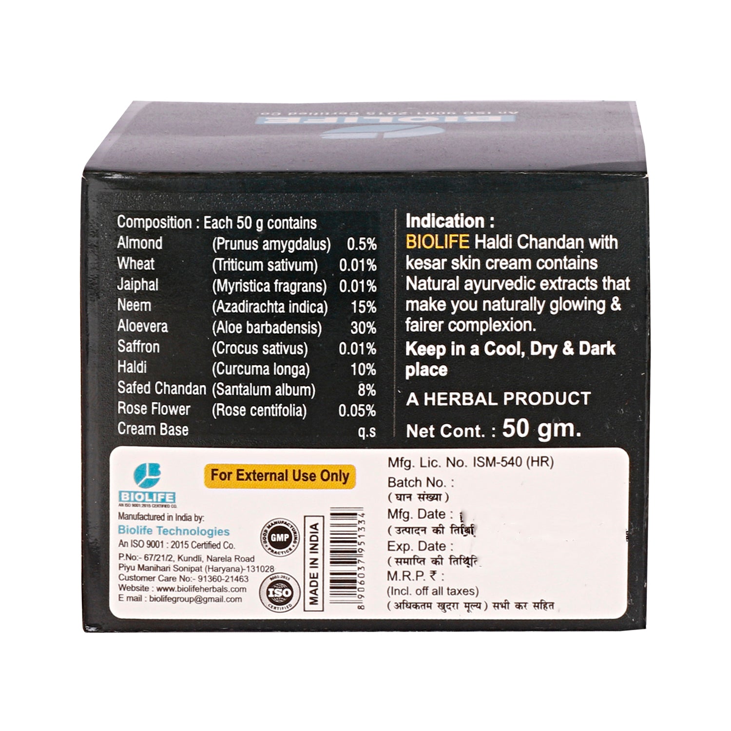 Biolife Haldi Chandan Cream contains goodness of Haldi, Chandan & Aloevera. Haldi has antiseptic properties, It prevents skin from infections. It gives instant glow to skin and tightens skin to prevent wrinkles. Chandan has cooling, Smoothing & Astringent properties. It also has antiseptic properties. Aloevera moisturises the skin.