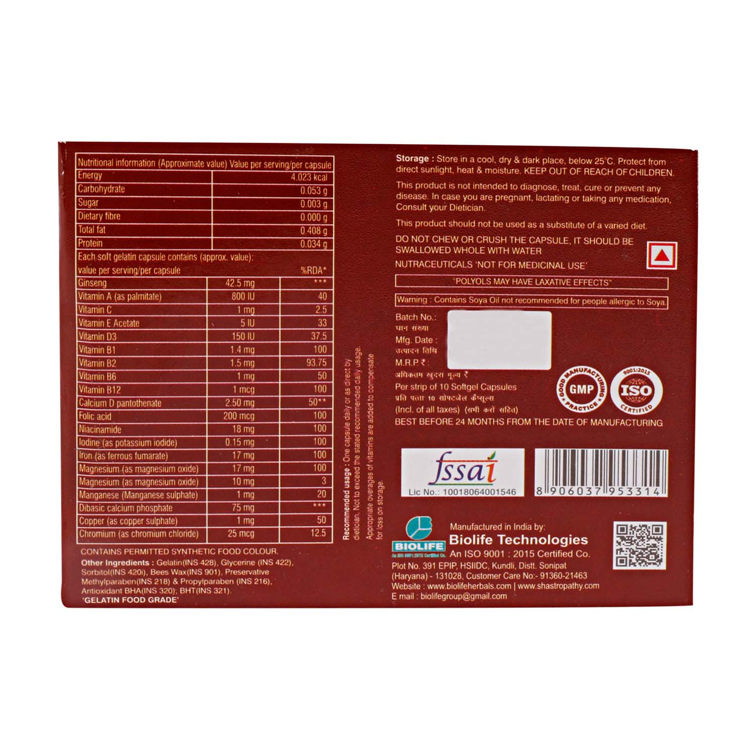 Composition: Ginseng , Vitamin A , Vitamin C , Vitamin E , Vitamin D3 , Vitamin B1 , Vitamin B2 , Vitamin B6 , Calcium D , Folic acid , Iodine , Iron , Magnesium , Mangnese , Copper