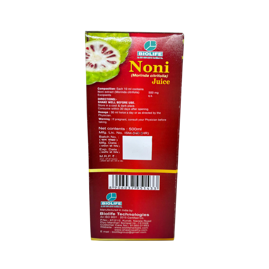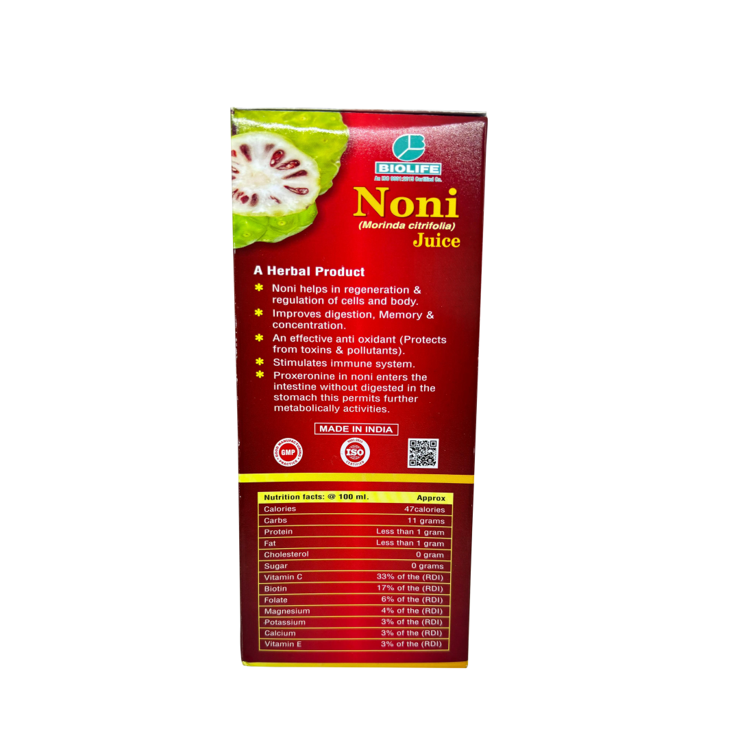 Noni syrup is mainly used to boost your immune system and has numerous health benefits against arthritis, cancer, cold, diabetes, drug addiction, fever, headaches, heart disease etc. It is also used to heal stomach ulcers, fight menstrual cramps, chronic fatigue syndrome etc. Noni is a completely safe method with no side effects . Indications: Extremely beneficial in nervous system, Corrects sexual disorders in males, Helps in regeneration and regulation of cells of body, Improve digestion memory and concentration, Excellent Antioxidant, Reduces the r</p>