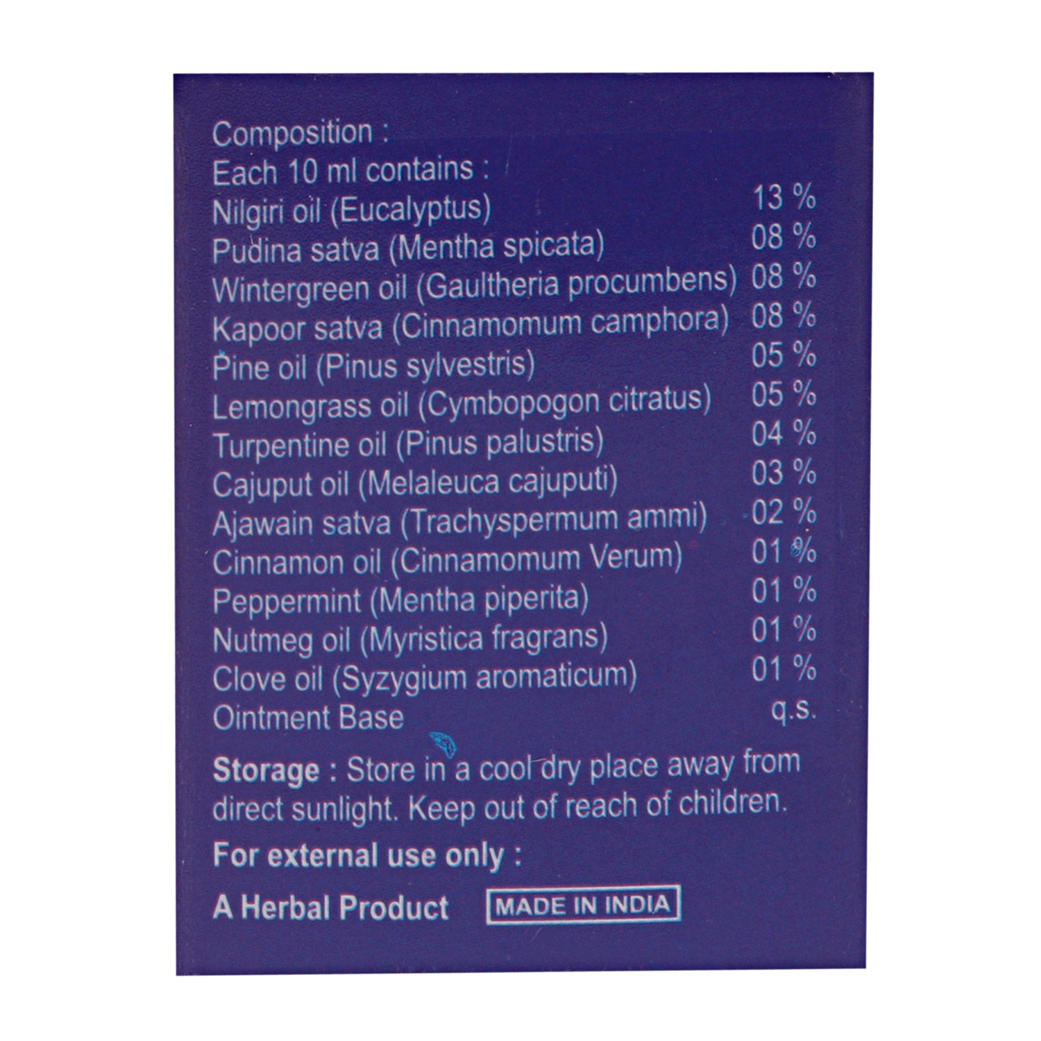Ingredients: Mahanaryan tail , Guggal satva , Gandhpuro tail , Telparni , Tarpin tail , kapoor , Pudina stava