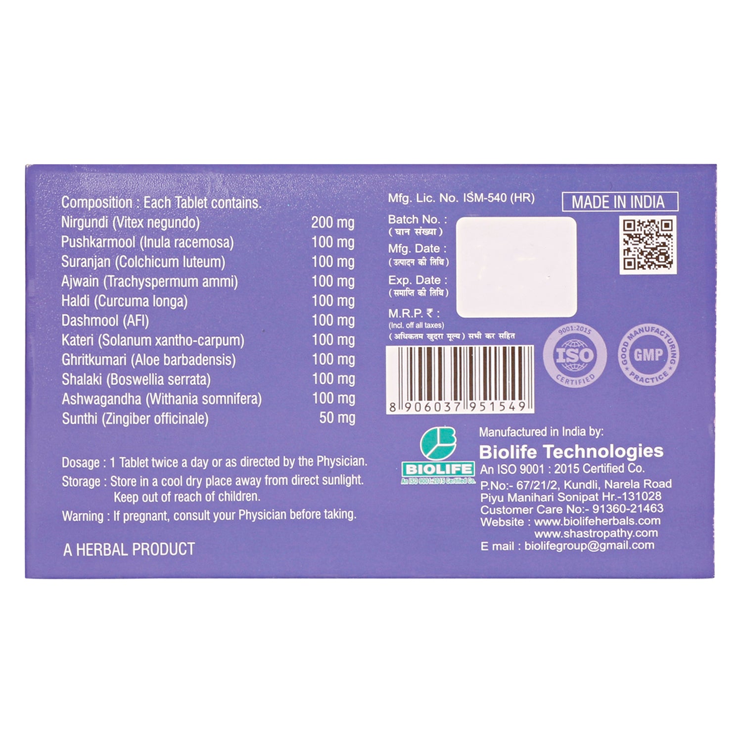 Ingredients: Nirgundi , Pushkarmool , Suranjan , Ajwain , Haldi , Dashmool , Kateri , Ghritkumari , Shallaki , Ashwagandha , Sonth
