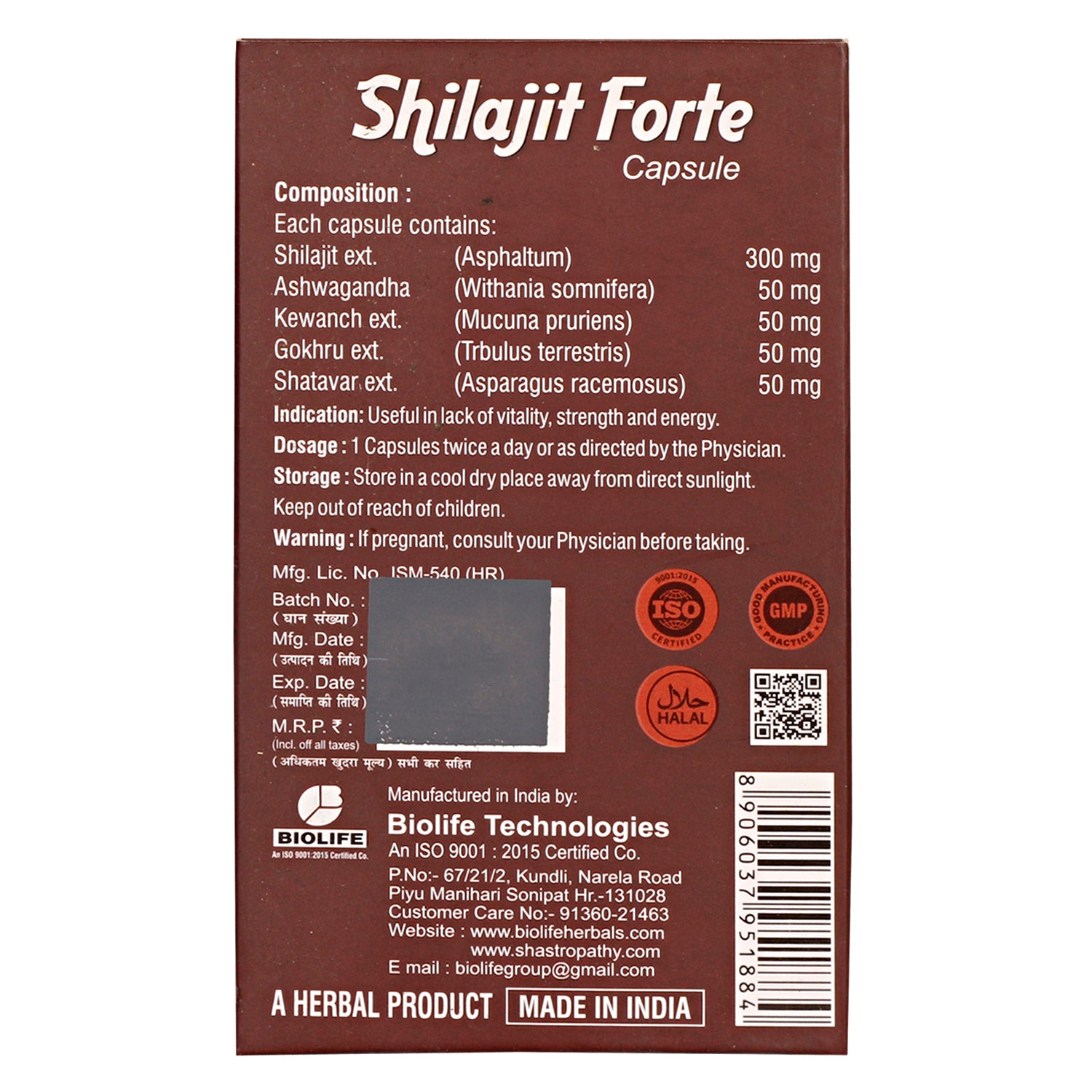 Shilajit Capsules is good for general health and helps increase strength, stamina, vigour and vitality. Indications: Useful in lack of vitality, strength and energy.