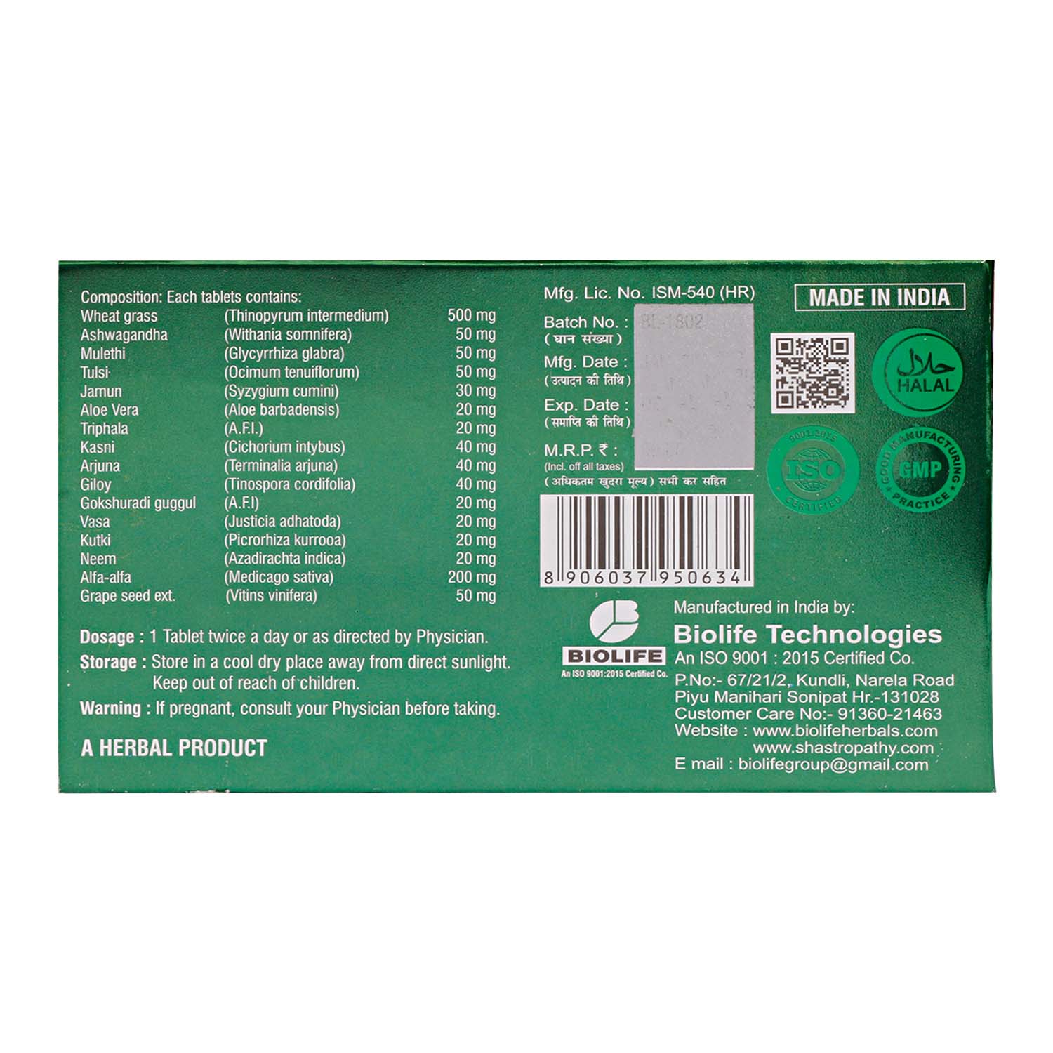 Ingredient: Wheatgrass , Ashwagandha , Mulethi , Tulsi , Jamun , Aloe vera , Trifala , Kasni , Arjuna , Giloy , Gokshura , Guggul , Vasa , Kutki , Neem , Alfa-Alfa , Grape seed
