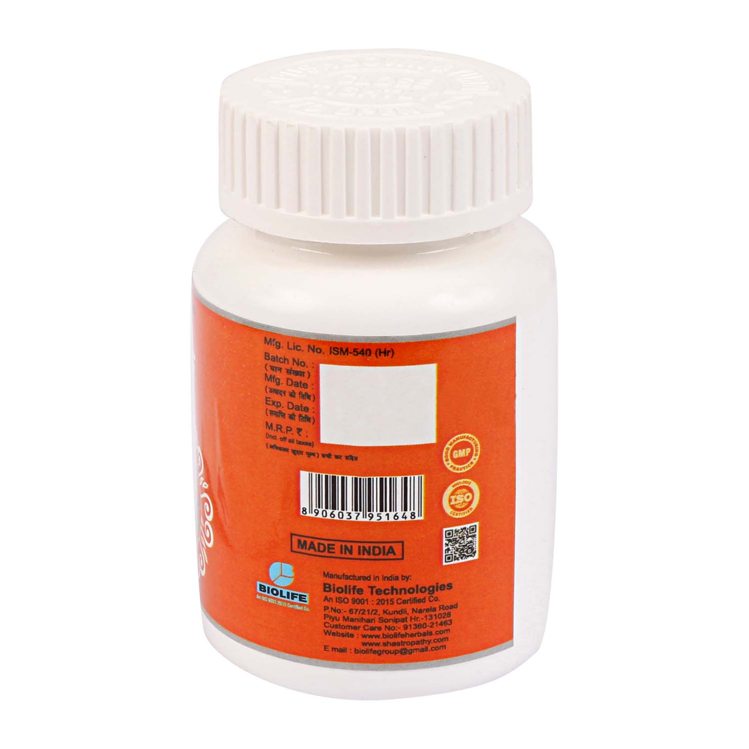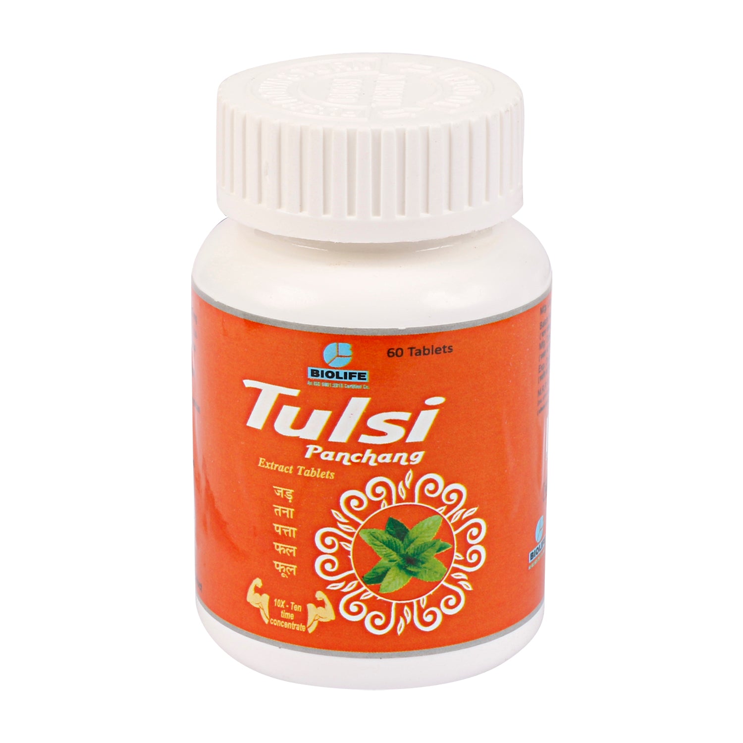 This is an "A Herbal Product" in tablet form, with Tulsi extract (Ocimum sanctum) as the primary active ingredient. Each tablet contains 250 mg of Tulsi extract. The product is manufactured in India by Biolife Technologies, a company that is ISO 9001:2015 Certified and follows Good Manufacturing Practices (GMP).