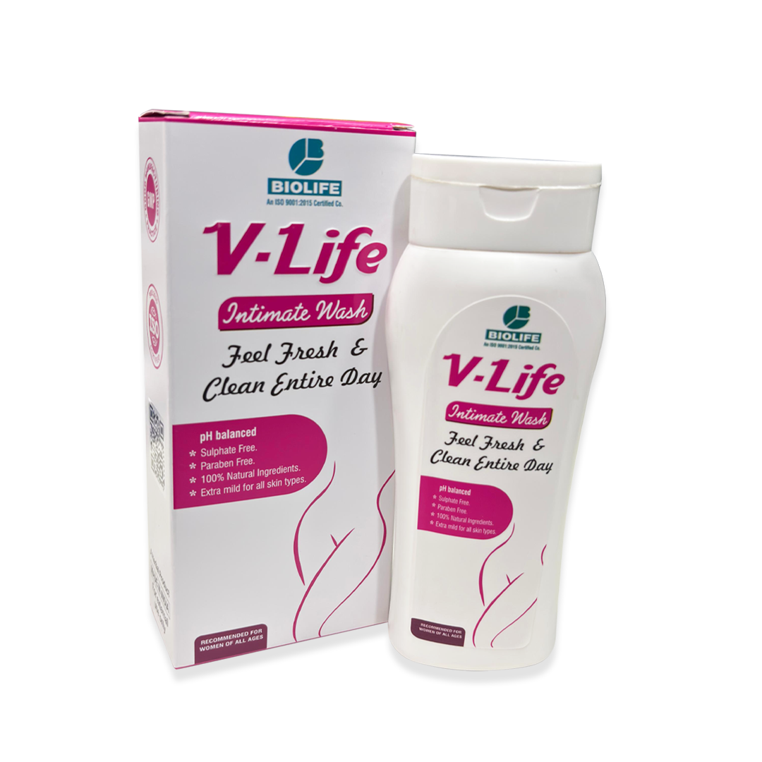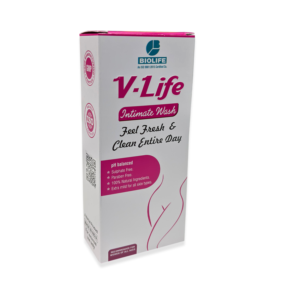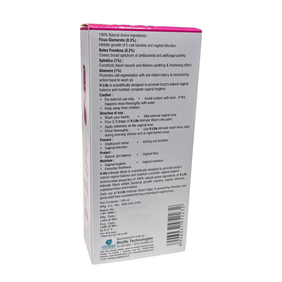 V-life Intimate Wash Natural intimate wash is scientifically designed to promote body’s natural vaginal balance and maintain complete vaginal hygiene. Antimicrobial properties of 100% natural active ingredients of V-life Intimate Washinhibit bacterial growth causing vaginal infection, unpleasant odour and irritation. Daily use of V-life Intimate Wash helps in preventing infection and gives relief from consistent itching or burning in vaginal area.