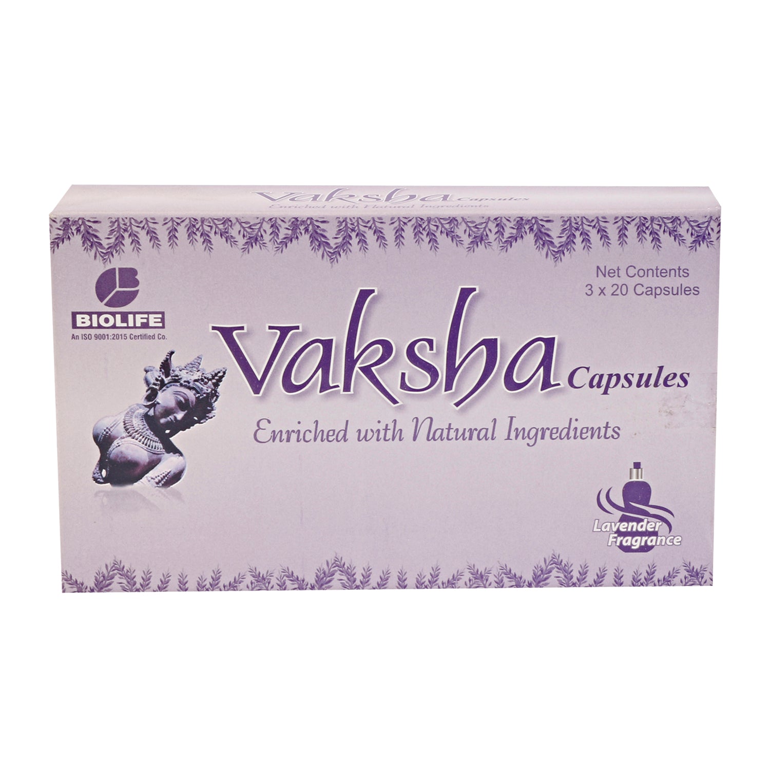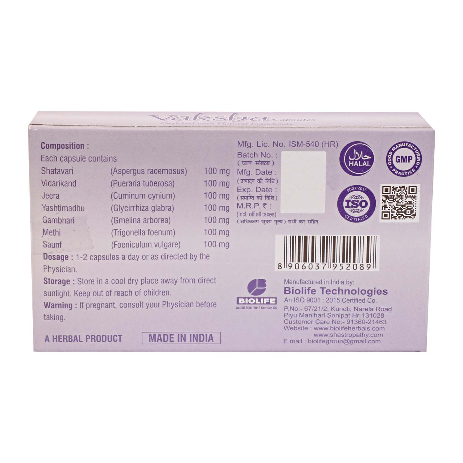 Biolife Vaksha Capsules, an Ayurvedic supplement formulated with a balanced blend of six potent natural ingredients. Each capsule is a precise $100\text{ mg}$ dose of time-honored herbs like Shatavari (Asparagus racemosus), Yashtimadhu (Glycyrrhiza glabra or Licorice), Vidarikand, and Methi, designed to support general wellness and vitality.