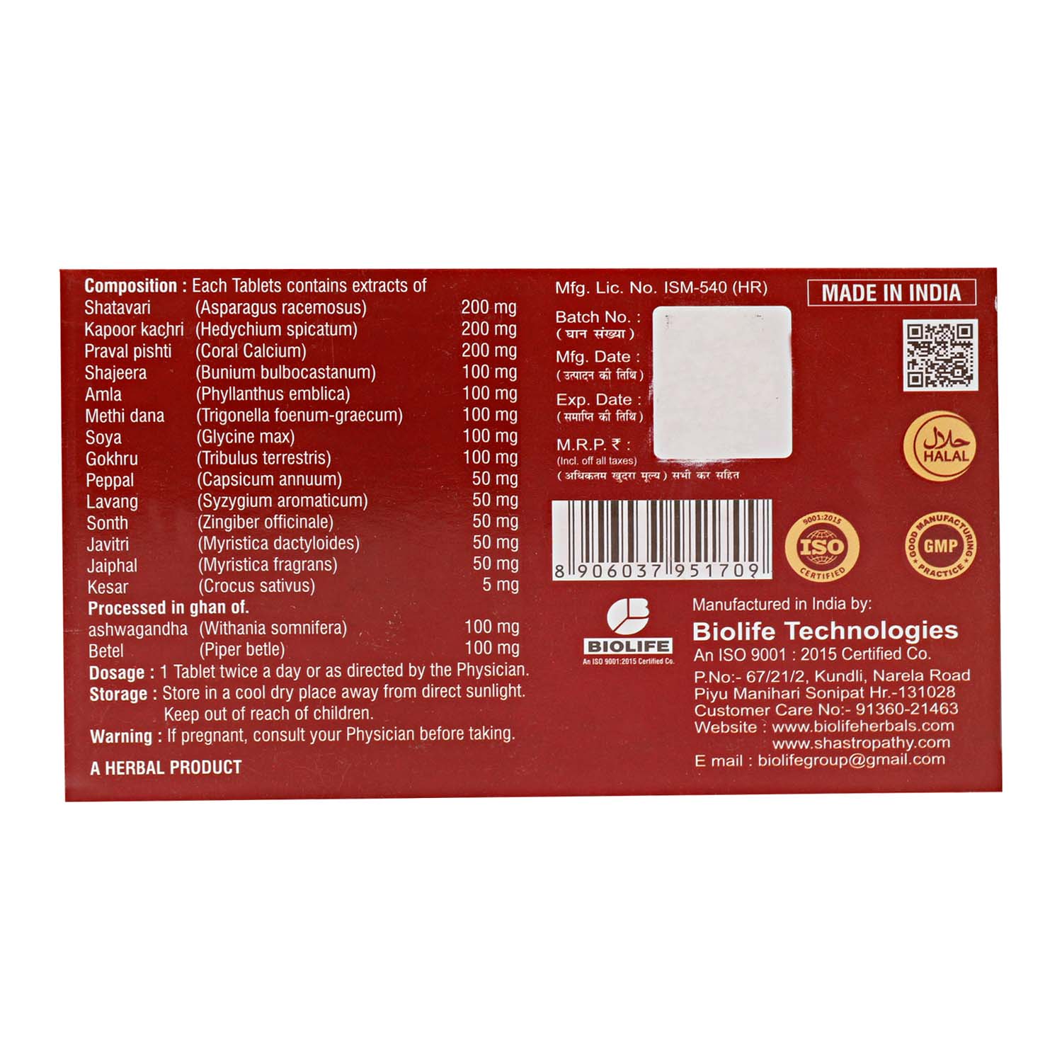 Ingredients: Shatavari , Kapoor kachri , Praval pishti , Syaha jeera , Amla , Gokhru , Pippali , Loung , Saunth , Javitri , Jaiphal , Kesar , Ashwagandha , Paan